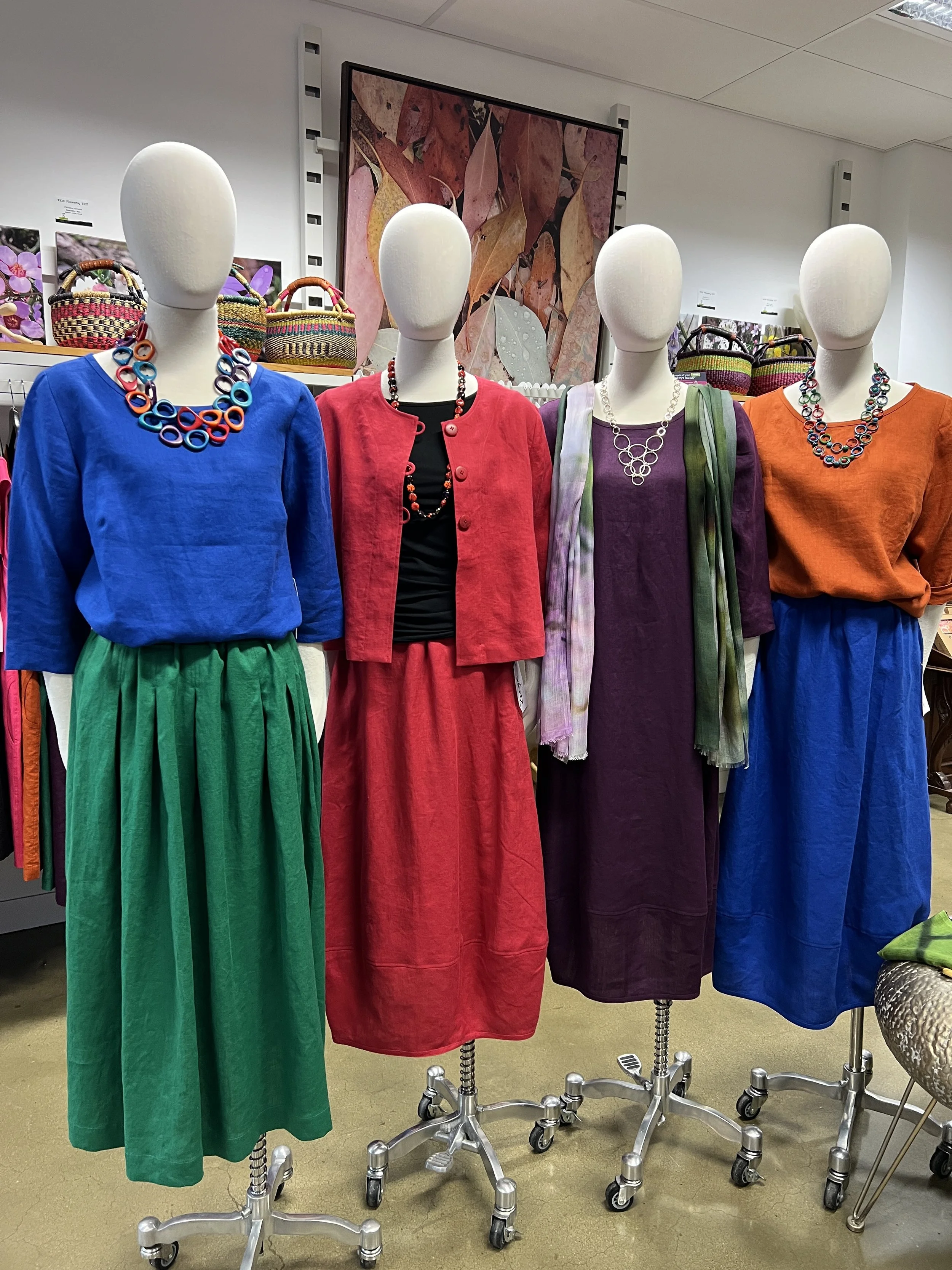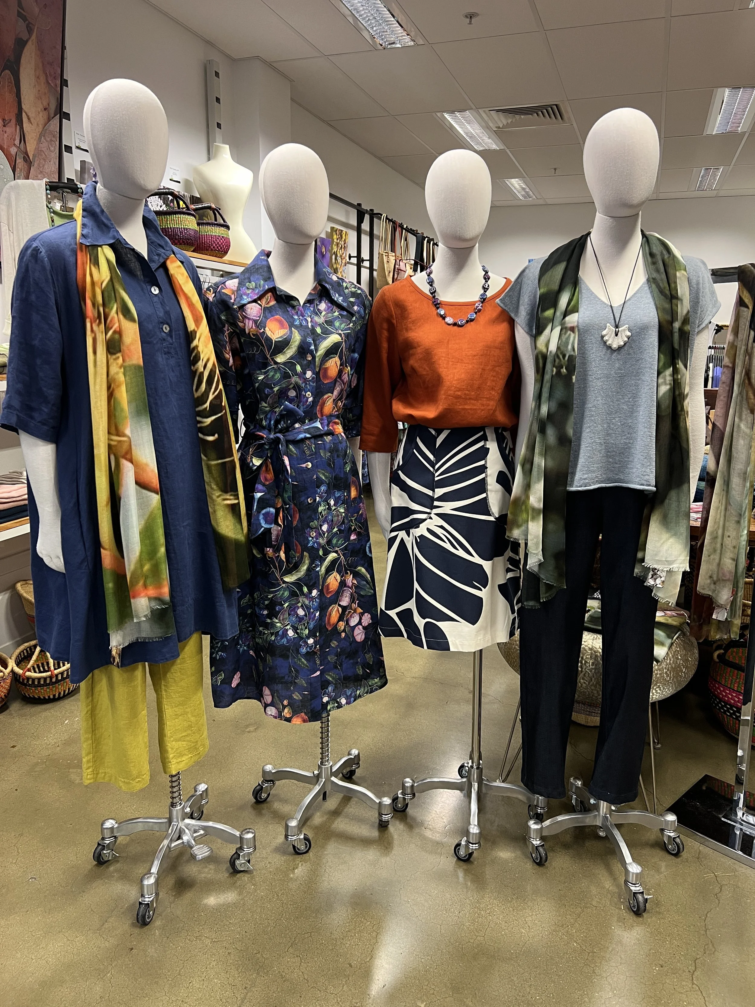 Valia Rail Dress $309 NOW $210 Idyl linen Pant $179 NOW $145 Kimberley Tonkin Shirt Dress $469 NOW $325 Zeega Box Top $165 Essaye Avril Skirt $140 NOW $98 Uimi Tully Tee $149 Essaye Pull On Denims $145 NOW $101 K8 Bush Scarves $85